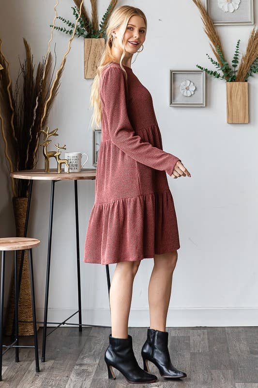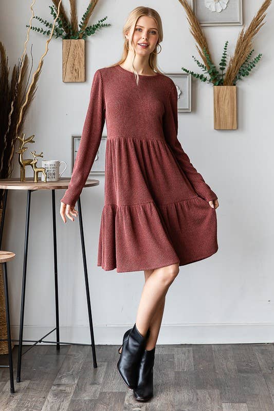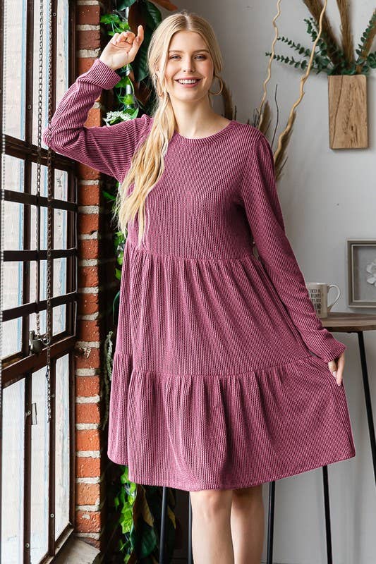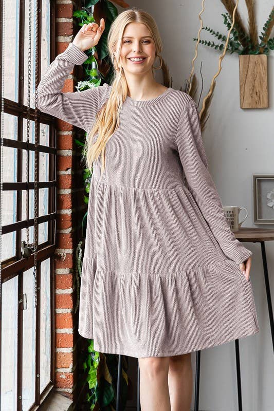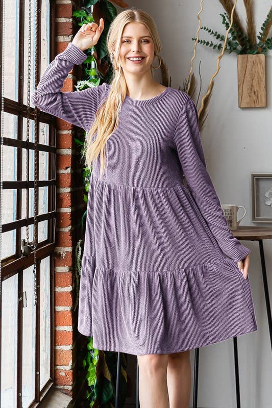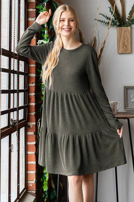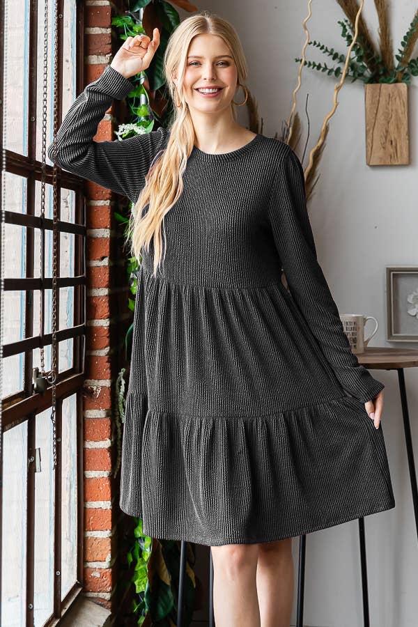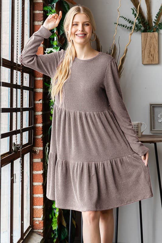 LONG SLEEVE SOLID URBAN RIBBED TIERED MINI DRESS
