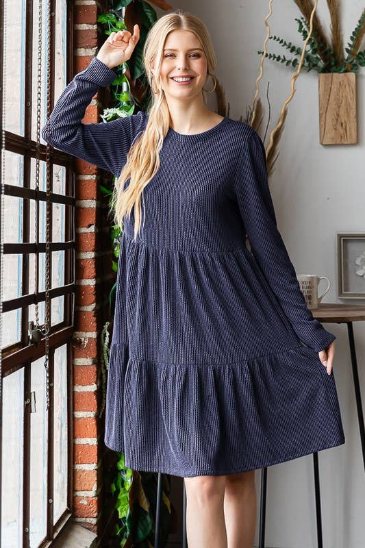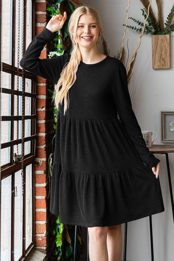 Adorable babydoll dresses. Stylish and affordable! Long Sleeve, Round Neck, Solid Colors, Urban Ribbed Tiered Mini Dress.